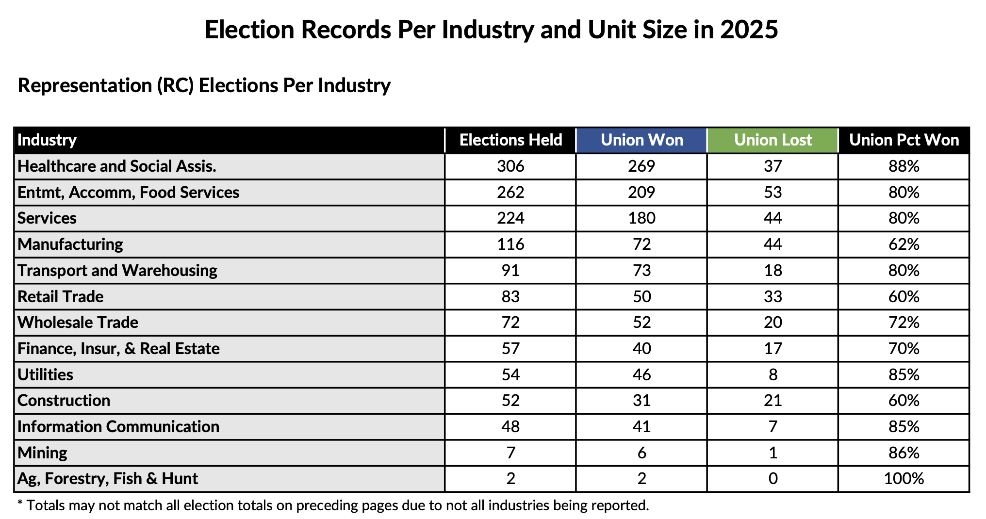Let’s get this out of the way first: Yes, that’s a higher percentage of union wins as opposed to 60% union wins in the construction and manufacturing industries or 80% in transport and warehousing. The total number of non-healthcare elections averages out to a 75% union win rate in 2025.